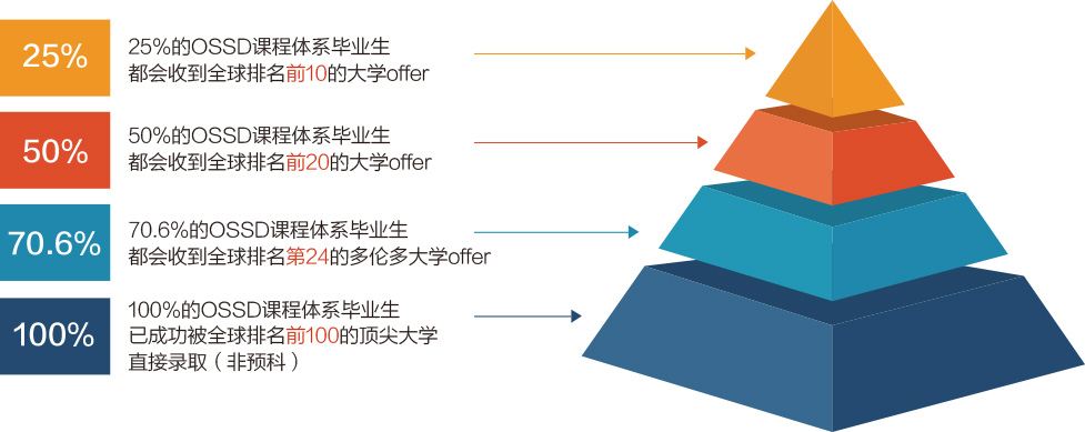 OSSD(Ontario Secondary School Diploma)是加拿大安大略省高中毕业文凭,是世界高质量、最权威的非应试中学教育体系之一,OSSD学术成绩受到加拿大、美国、英国、澳大利亚、新西兰、新加坡等全世界大学认可,是进入世界顶级名校的通用文凭。